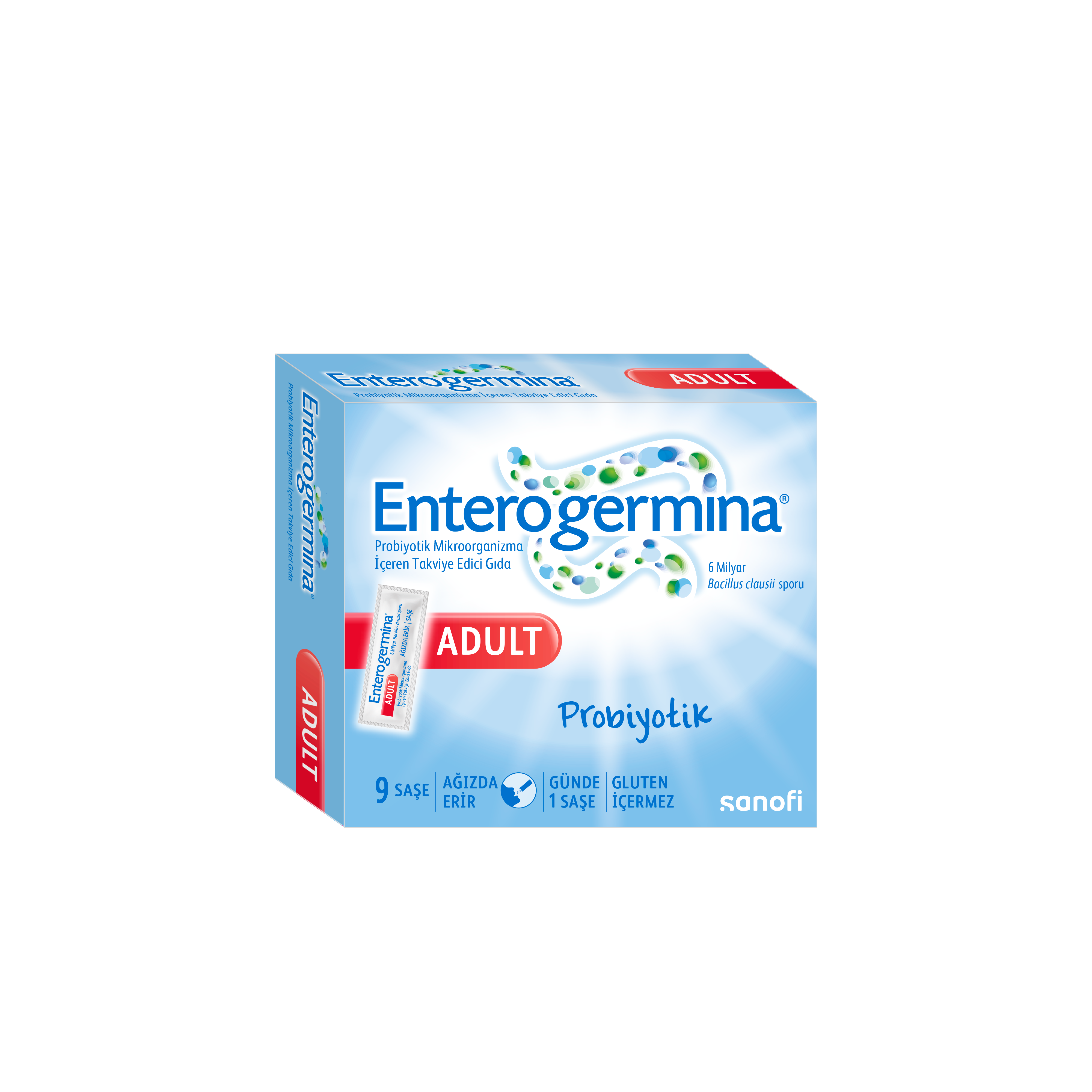 Yetişkinlerde, sindirim sistemini düzenleme ve bağışıklık sistemini desteklemeye yardımcı olmak için 6 milyar kob Bacillus clausii sporu içeren susuz, tek kullanımlık saşelerde sunulur.